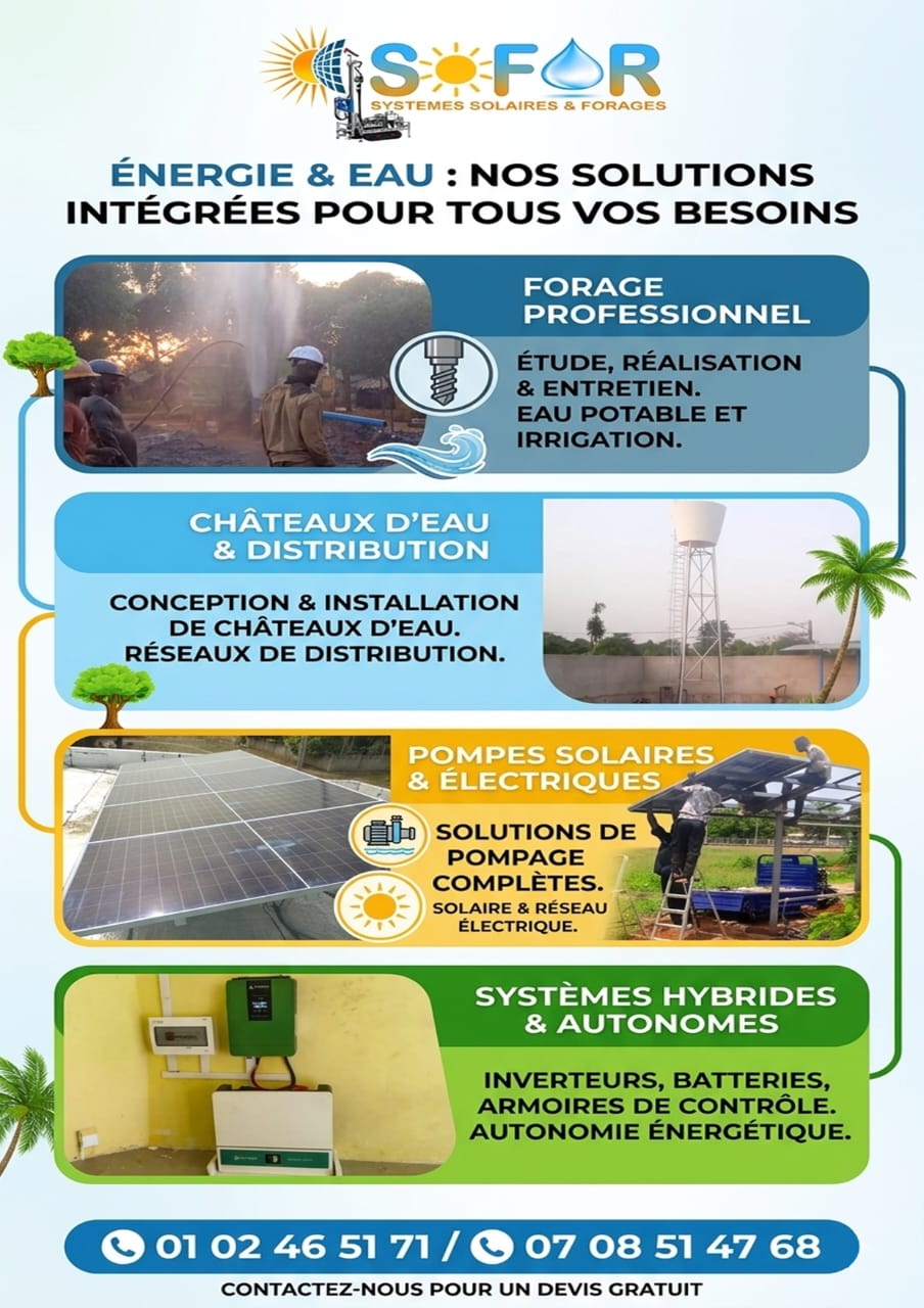 Face aux enjeux croissants liés à l’accès à l’eau potable et à l’énergie, une entreprise se distingue par la qualité et la fiabilité de ses solutions : SOFOR (Systèmes Solaires & Forages). Spécialisée dans les technologies modernes de forage et d’énergie solaire, cette structure propose une approche complète, durable et adaptée aux réalités locales. Installée à Abidjan, SOFOR met son expertise au service des collectivités territoriales, des entreprises et des particuliers. Son offre couvre l’ensemble de la chaîne, depuis l’étude technique jusqu’à la mise en service des installations. Parmi ses principales prestations figurent les forages professionnels d’eau, réalisés avec précision et efficacité, garantissant un accès durable à la ressource. L’entreprise se distingue également par la conception et l’installation de châteaux d’eau de grande capacité. Ces infrastructures essentielles permettent d’assurer une distribution fiable et continue de l’eau, notamment dans les zones rurales ou en pleine expansion urbaine. Dans un contexte de …